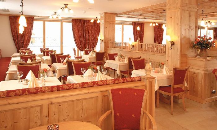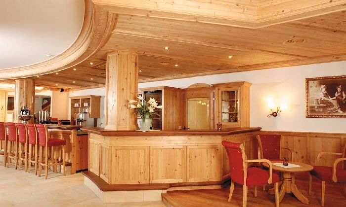 Der große Speiseraum im modernen Tiroler Landhausstil mit großen Panoramafenstern sorgt für gemütliche Atmosphäre. Die rustikale Hausbar und die Kaminstube laden zum geselligen Treffen am Abend ein.
